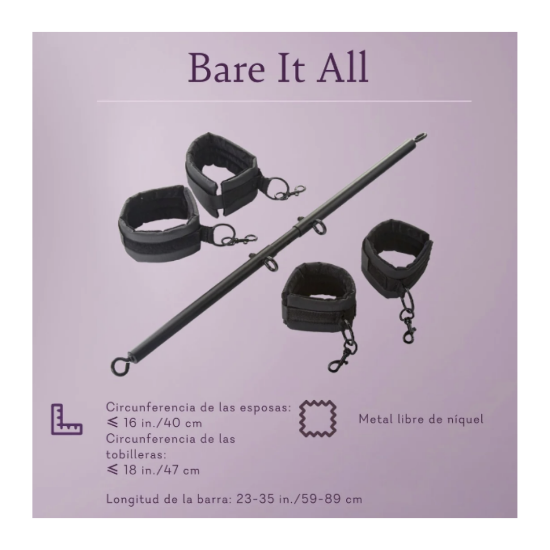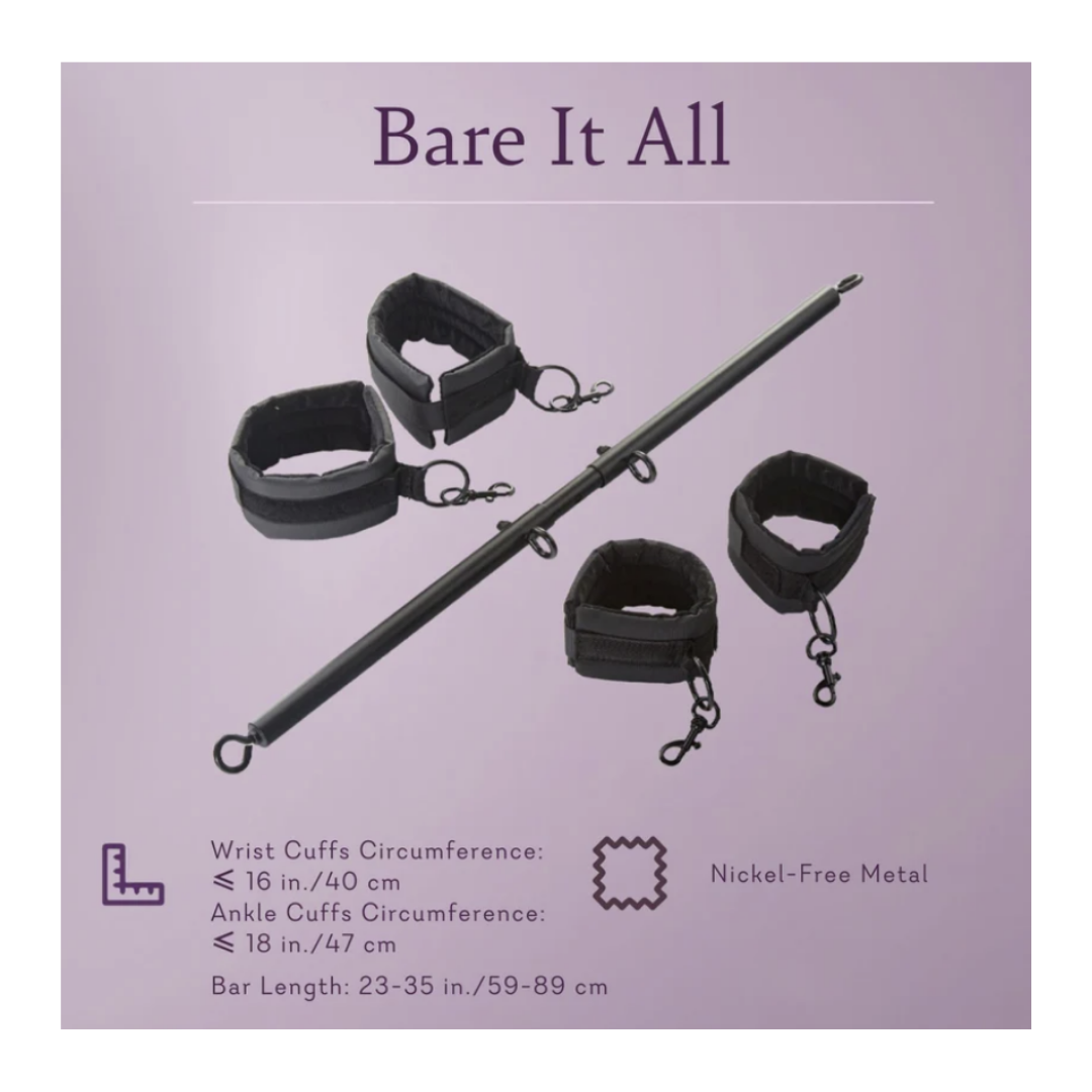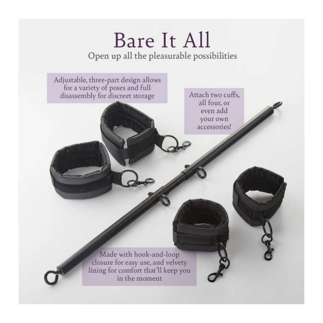 Submit to lust and bare it all with this spreader bar and cuff set. The four included cuffs and expandable bar allow for simple control or a variety of compromising positions.