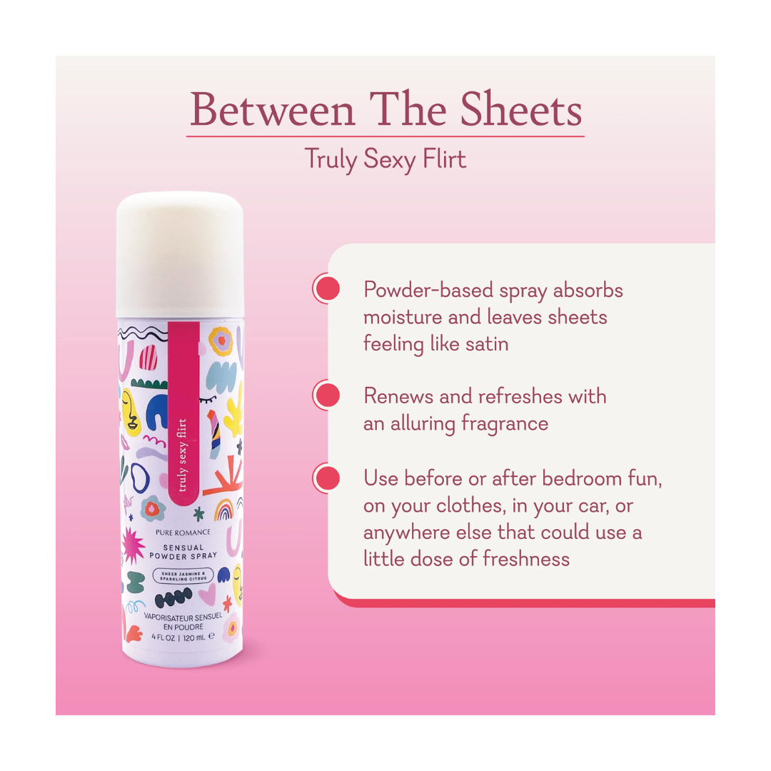 No se puede negar que lo fresco es sexy. ¡Entre las sábanas es un spray de lino a base de polvo que agrega una fragancia seductora donde sea que lo rocíes! Después de un poco de diversión en el dormitorio, rocíe una o dos veces para absorber la humedad y hacer que sus sábanas se sientan como satén. Entre las sábanas funciona como un ambientador de telas para su ropa, automóvil o en cualquier lugar donde desee disfrutar de un aroma irresistible que estimule el estado de ánimo.