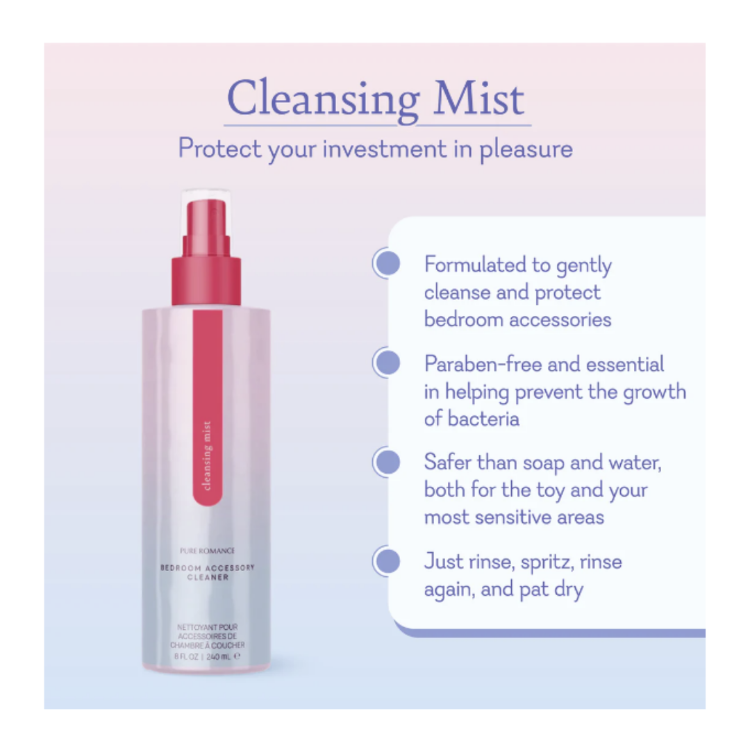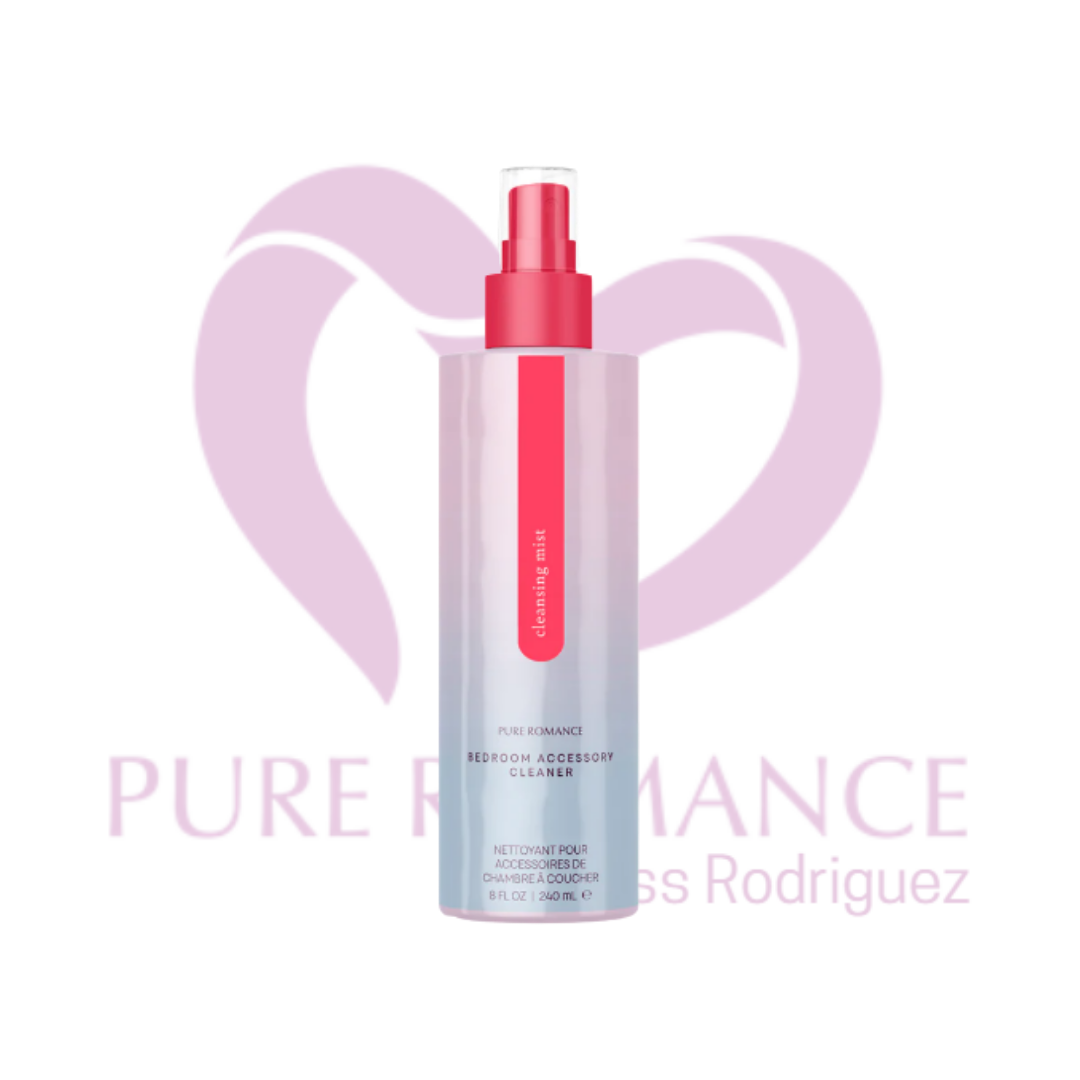 Los jabones comunes pueden secar e incluso dañar las superficies de tus accesorios íntimos, así que protege tu inversión en placer con un limpiador hecho especialmente para tus juguetes Pure Romance. Formulado para limpiar, proteger y pulir suavemente, Cleansing Mist es esencial para ayudar a prevenir el crecimiento de bacterias y mantener su colección de juguetes como nueva. Simplemente enjuague su juguete después de usarlo, rocíe generosamente con Cleansing Mist, luego enjuague nuevamente y seque.