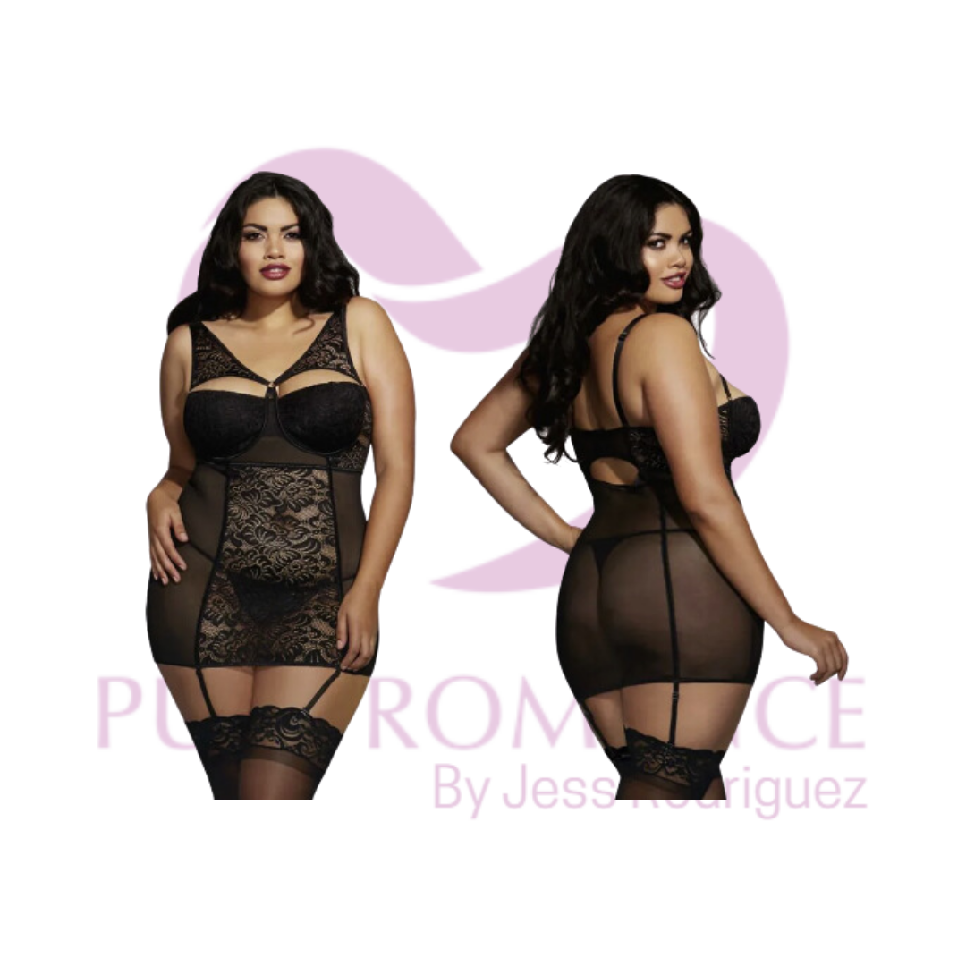 Encaje elástico y malla con cuatro ligas ajustables adjuntas • Copas moldeadas con aros y tirantes ajustables • Cierre trasero ajustable con corchetes • Detalle recortado exclusivo sobre el busto • Medias hasta el muslo no incluidas • S, M, L, 1X, 2X, 3X