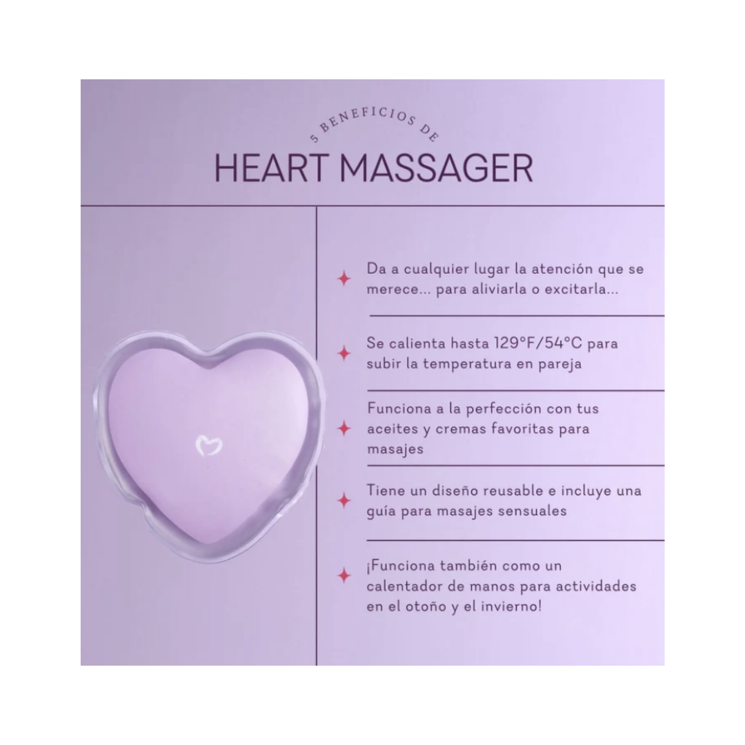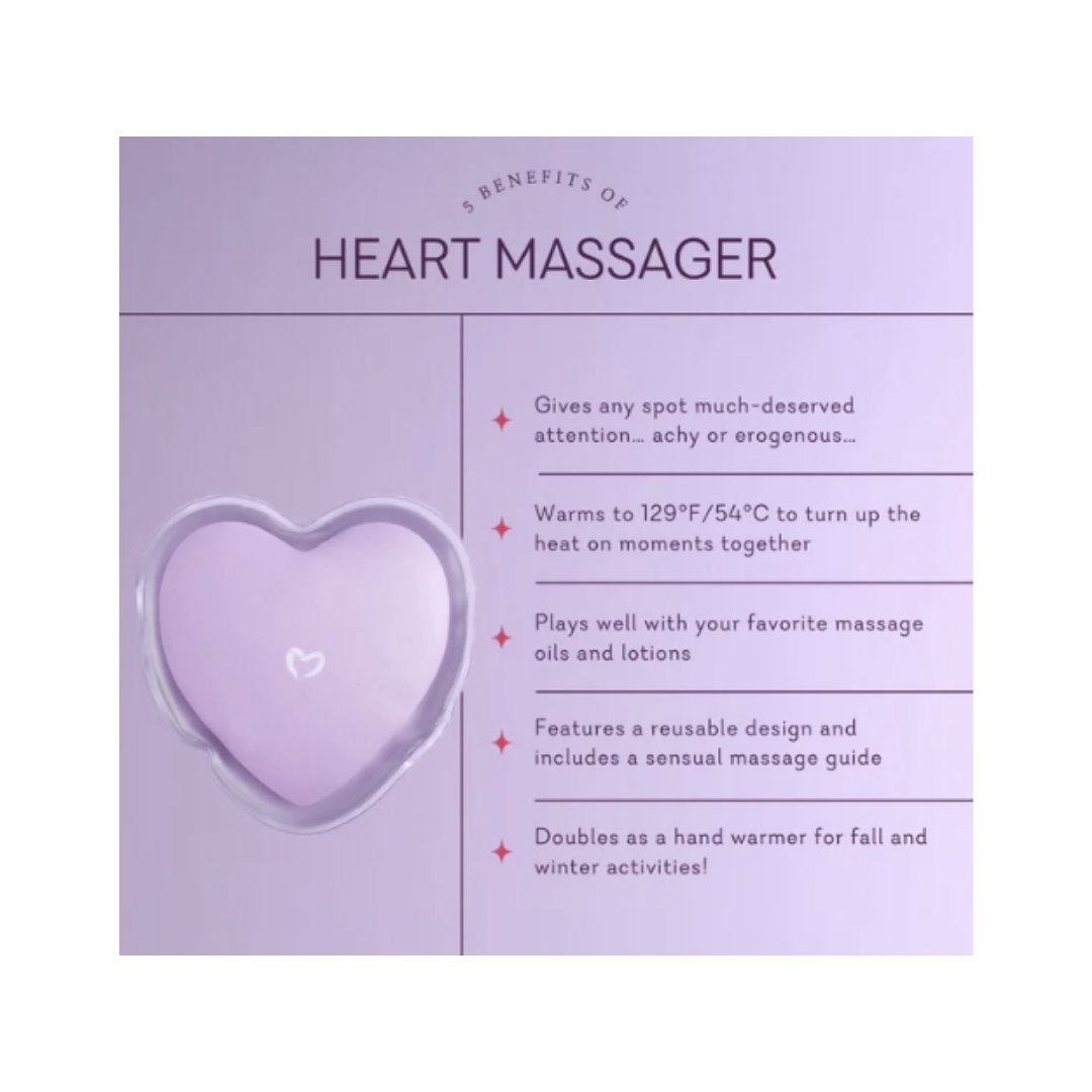 Lleva tu masaje sensual al siguiente nivel con este paquete de calor en forma de corazón. Active el Heart Massager encajando el disco de metal en el interior, luego espere a que se caliente a más de 129 °F/54 °C. Úselo con una loción de masaje para tener la sensación de un masaje relajante con piedras calientes en su propia casa.