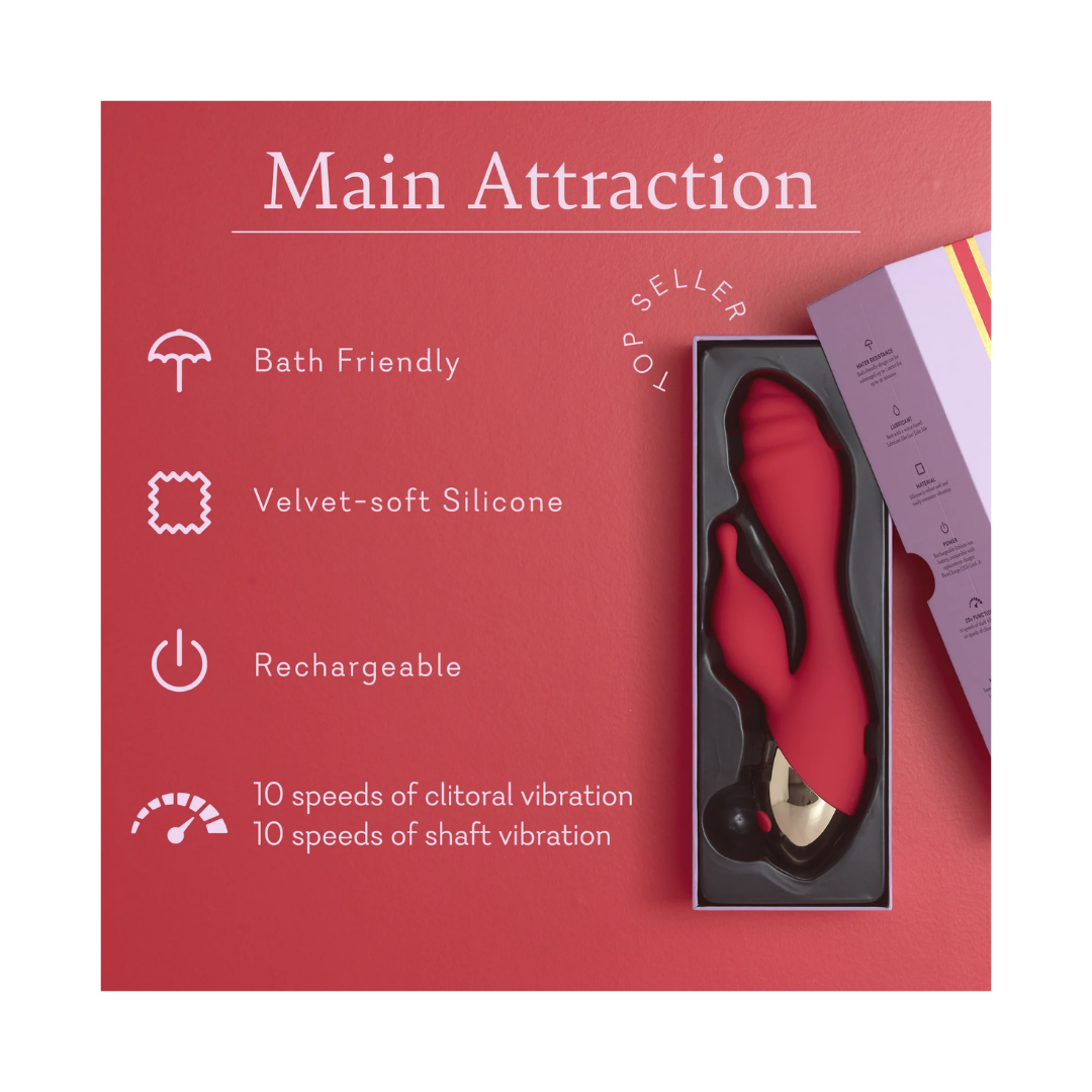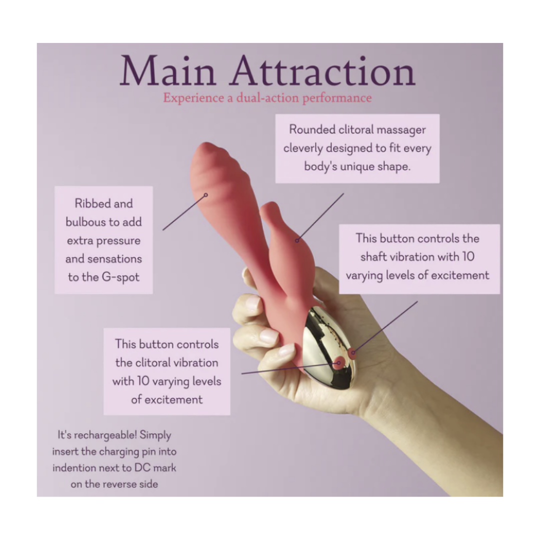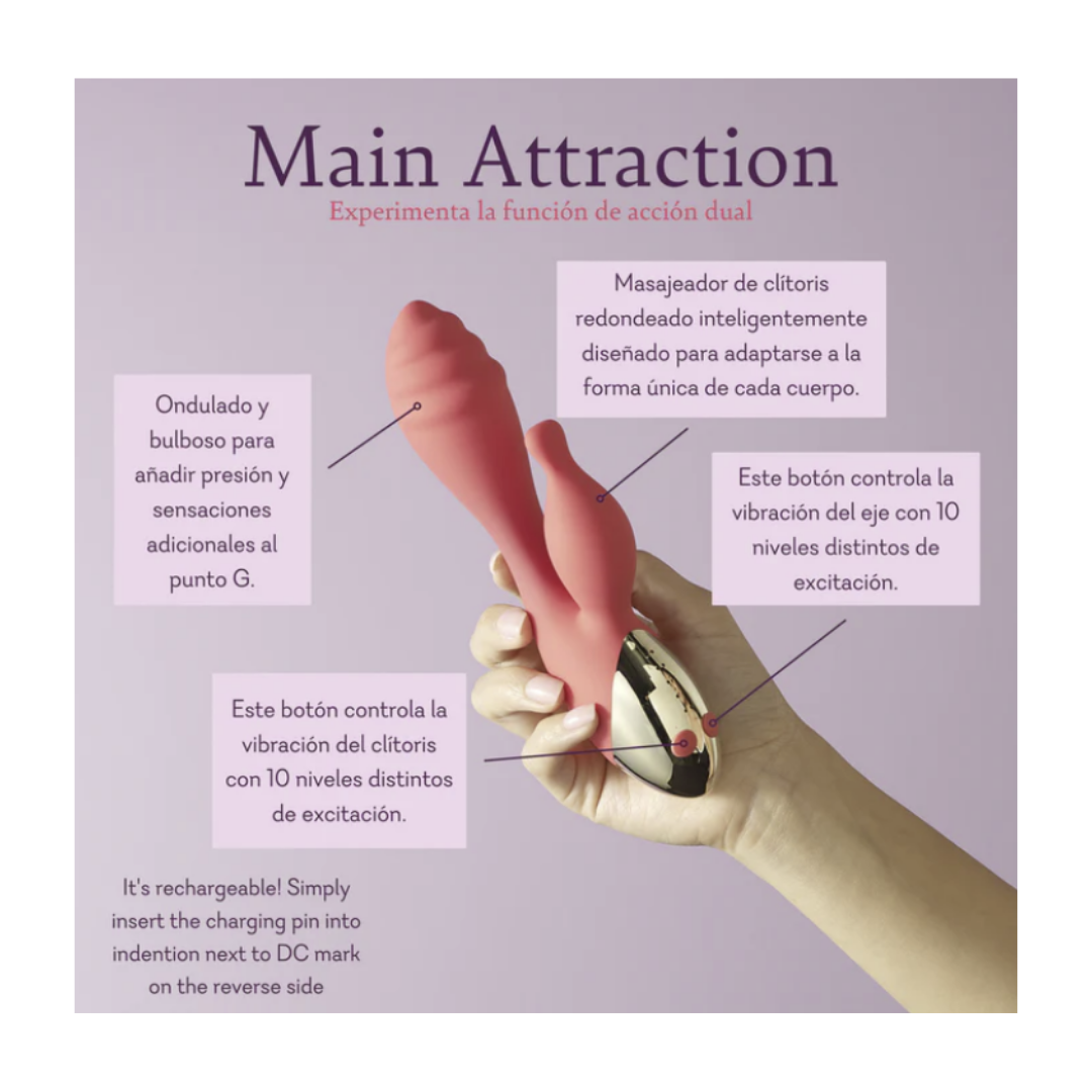 ¡Bienvenido a la atracción principal! Este vibrador de silicona de doble acción dirige su placer con 20 velocidades de vibración del eje y del clítoris controlados de forma independiente para una experiencia de placer completamente personalizada. La punta estriada del eje masajea tu punto G, mientras que el masajeador de clítoris cónico ofrece un rendimiento brillante durante todo el camino hasta los créditos finales.
