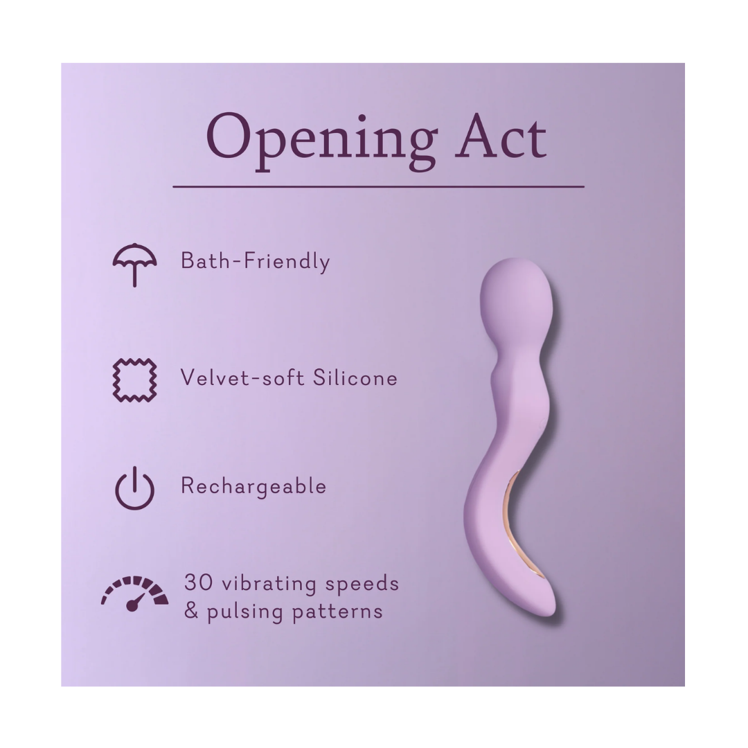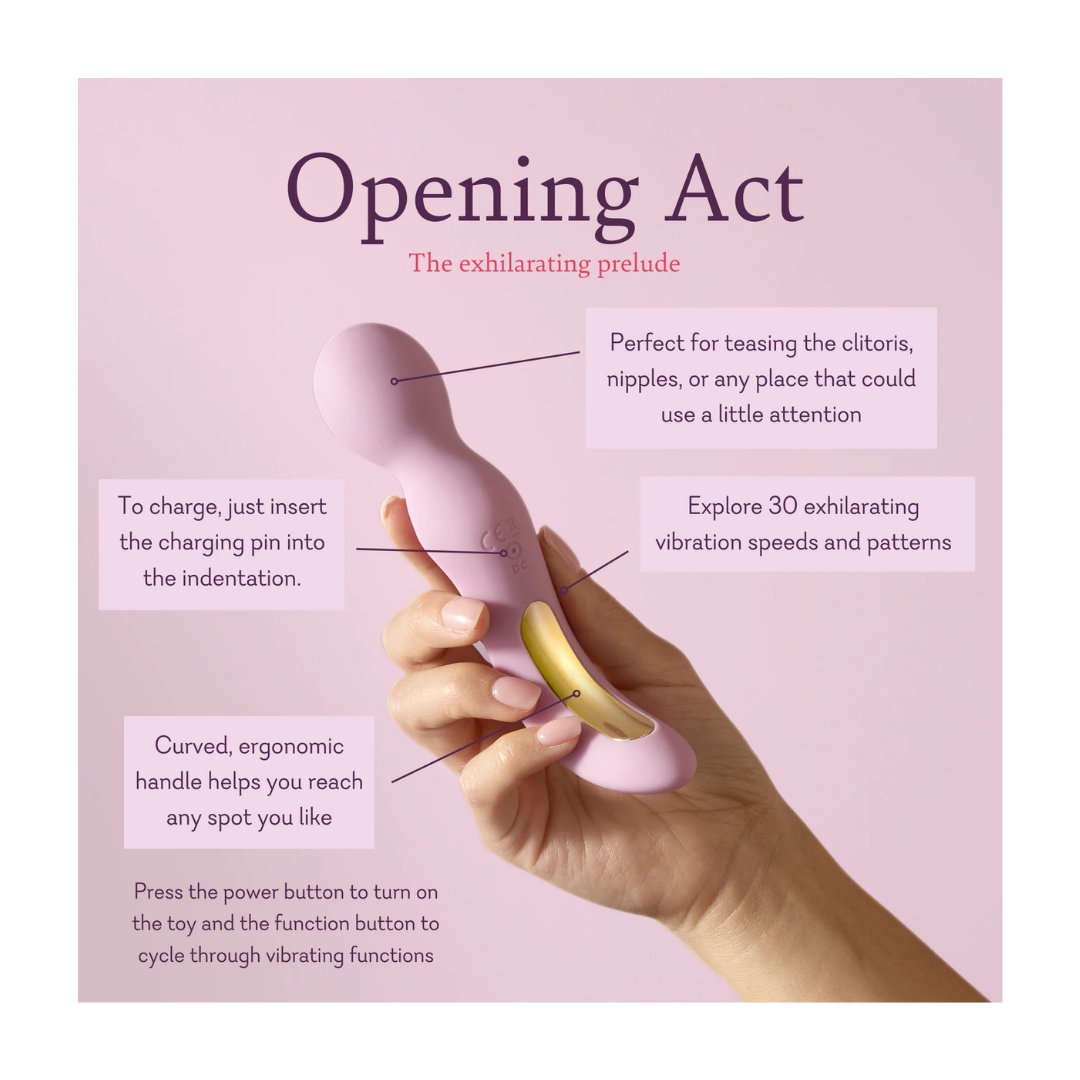 El estimulante preludio de todos los espectáculos nocturnos, Opening Act está diseñado para su placer con 30 fascinantes vibraciones y patrones pulsantes. Este vibrador de silicona que roba la escena está diseñado para tentar tu clítoris, pero también puedes bailarlo en cada curva para un emocionante masaje de cuerpo completo.