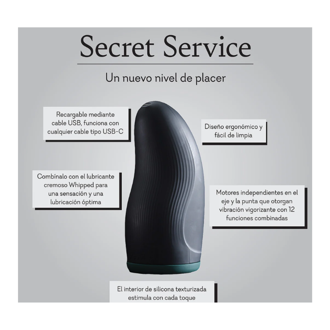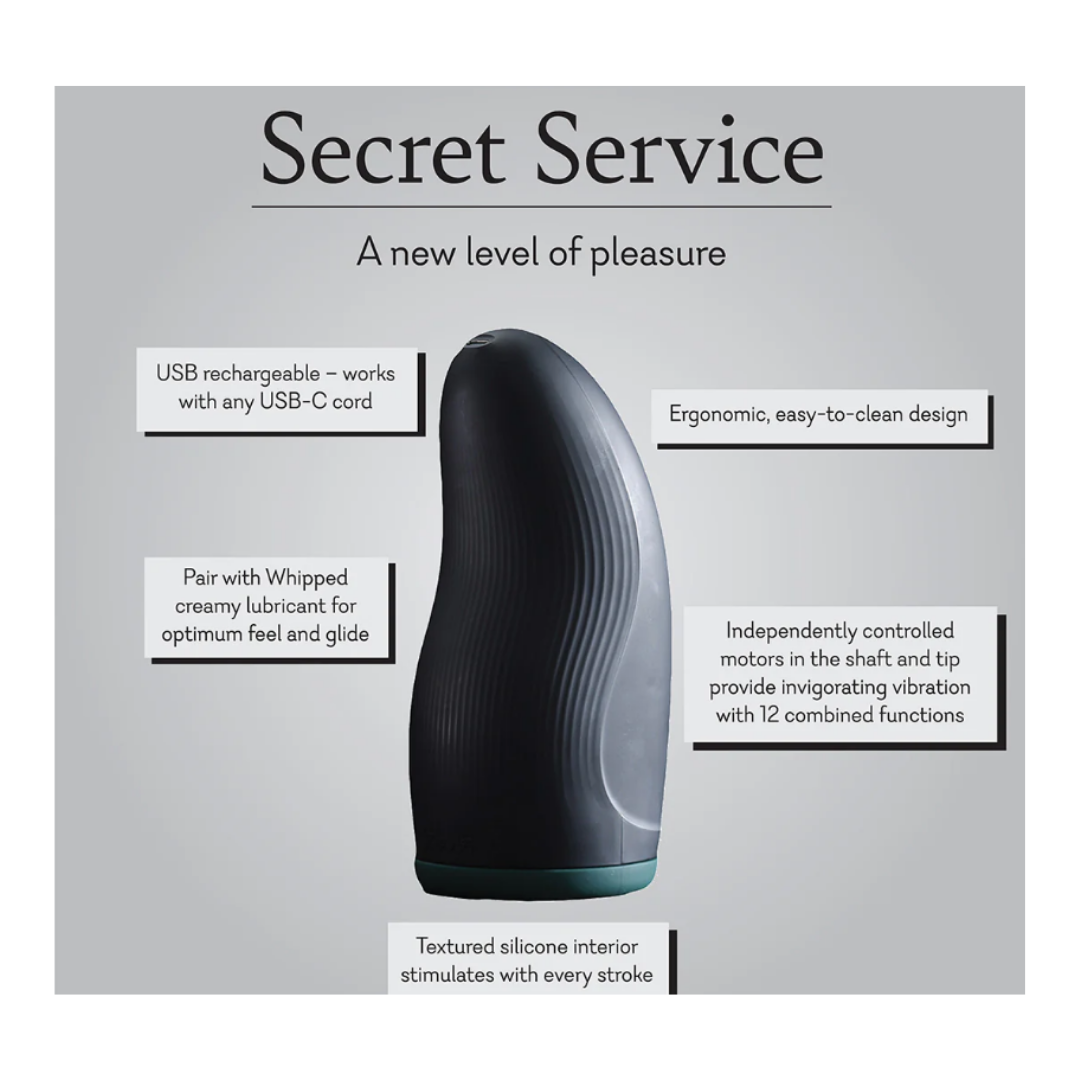 Take your solo sessions to the next level with our vibration-enhanced masturbator, Secret Service. Featuring a textured silicone sleeve, two independently controlled motors that provide invigorating stimulation to both the shaft and tip, and 12 combined vibrating functions, you’ll be ready for a whole new experience you never knew you needed. Just apply a creamy lubricant, like Whipped, slide in, and enjoy the vibes.