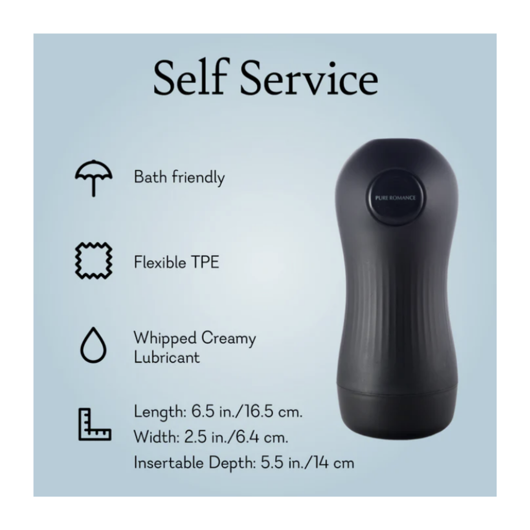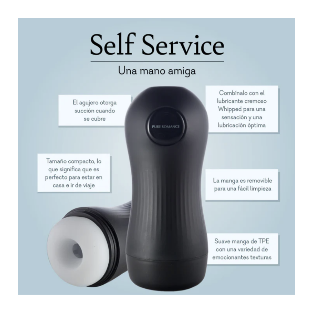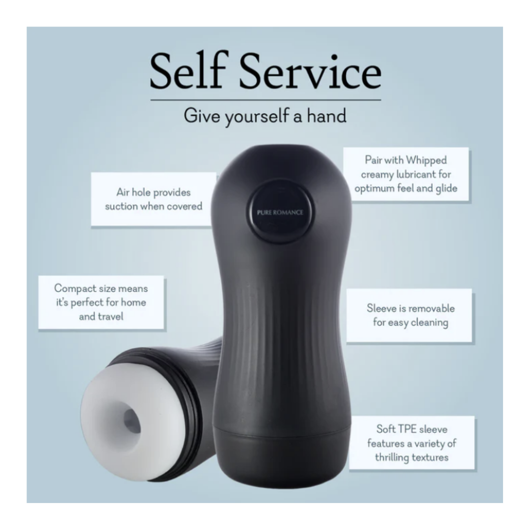 It’s time to give a hand to Self Service, our sleek and compact masturbator. Featuring a super soft sleeve and tantalizing texture, Self Service is the perfect enhancement to your solo sessions. Just apply a creamy lubricant, like Whipped, slide in, and enjoy. The included air hole provides on-demand suction for a heightened experience, and the sleeve itself is removable so it’s easy to clean and dry.