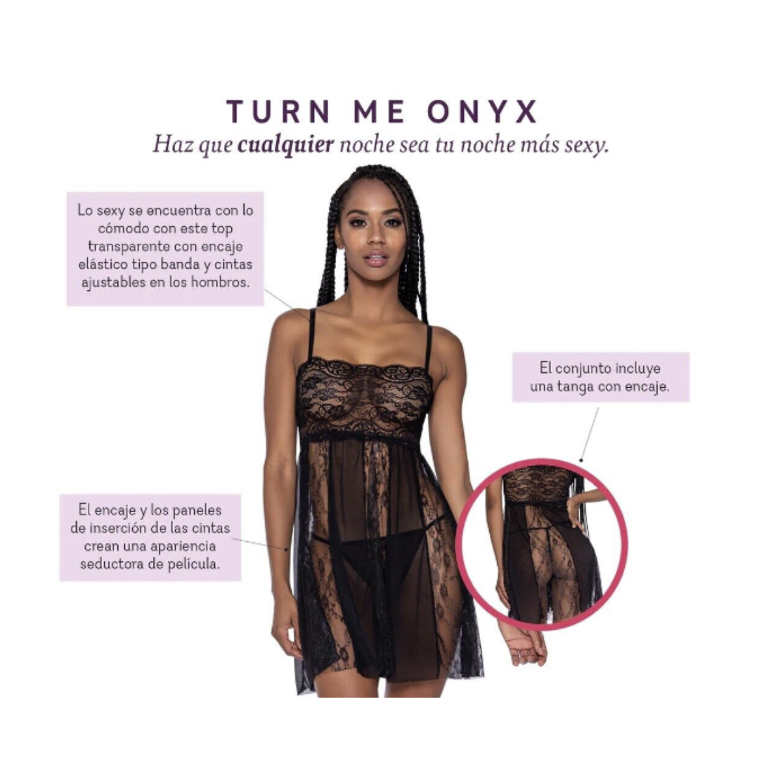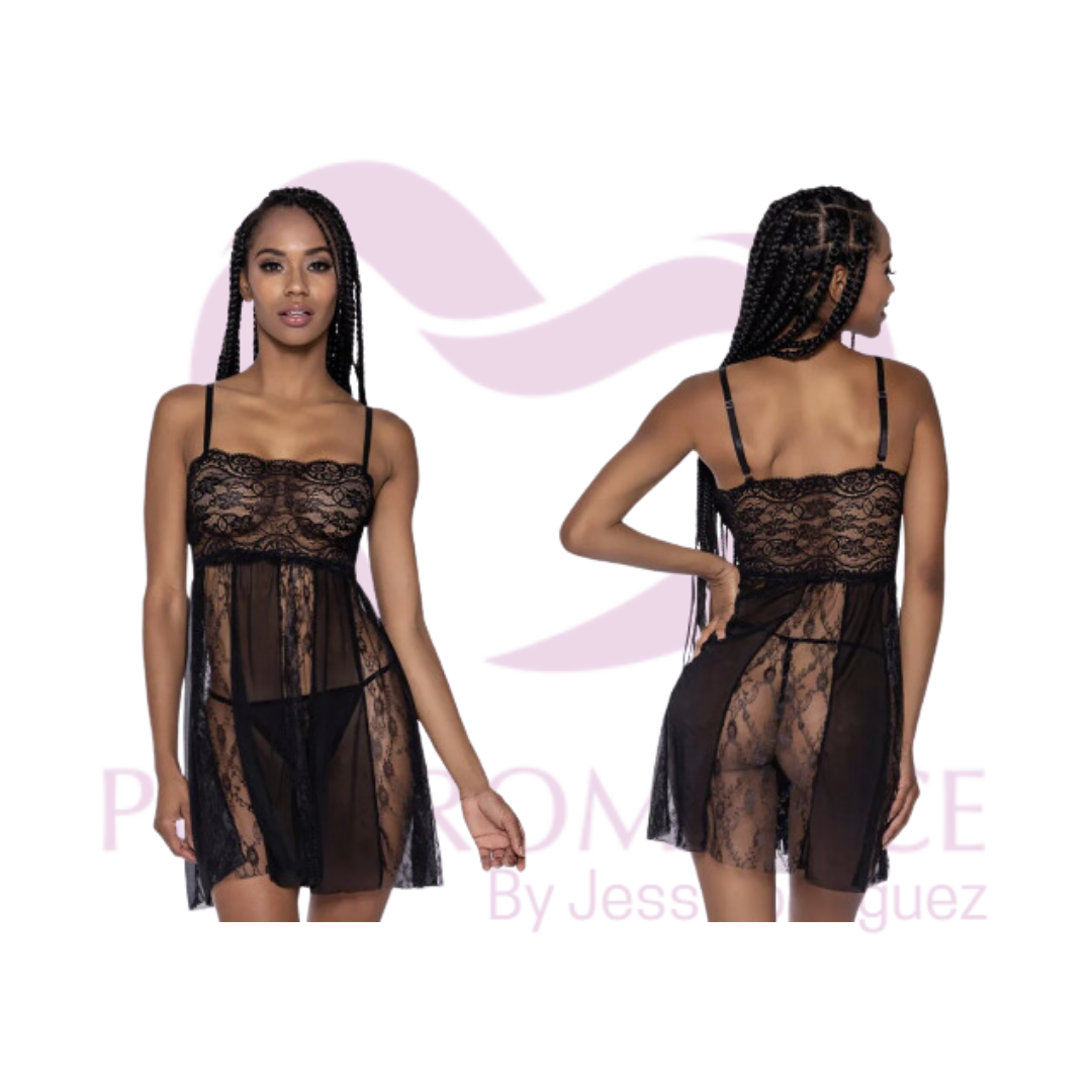 Make any night the sexiest night of the year with cascading lace and pleasure. The bandeau-style flows into beautiful mesh-and-lace inset panels, creating a seductive noir showcase for any occasion. Pair this sheer babydoll with the included g-string or go bare and let your hips do the talking.