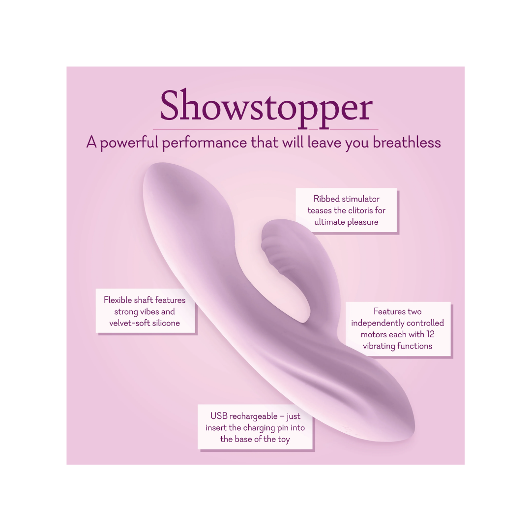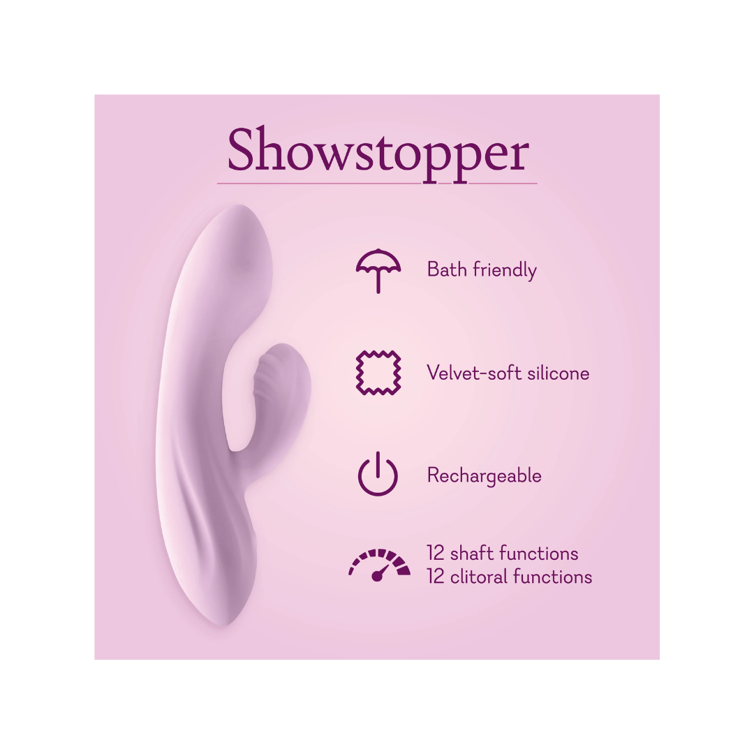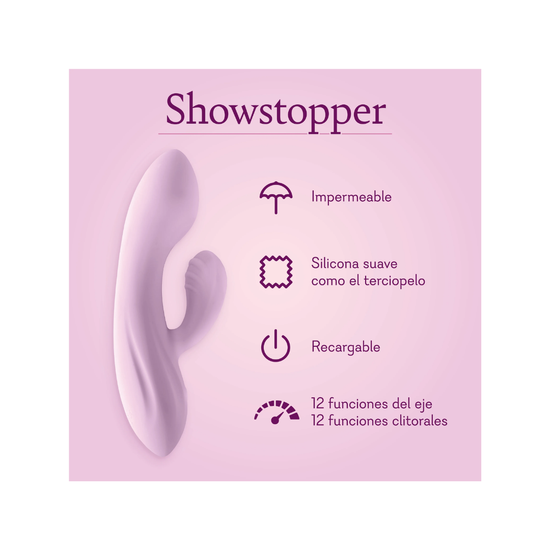 Olvídate de Netflix y relájate, esta potente vibración de doble acción tiene todo lo que necesitas para una experiencia erótica fuera de la pantalla. Showstopper cuenta con controles independientes para las vibraciones del clítoris y del eje, ¡los cuales ofrecen hasta una docena de velocidades y patrones! Encuentra tu nueva combinación favorita de sensaciones (¡y orgasmos!) mientras el eje curvilíneo apunta a tu punto G y el masajeador texturizado estimula tu clítoris al mismo tiempo. Luces, cámara ya disfrutar del espectáculo…