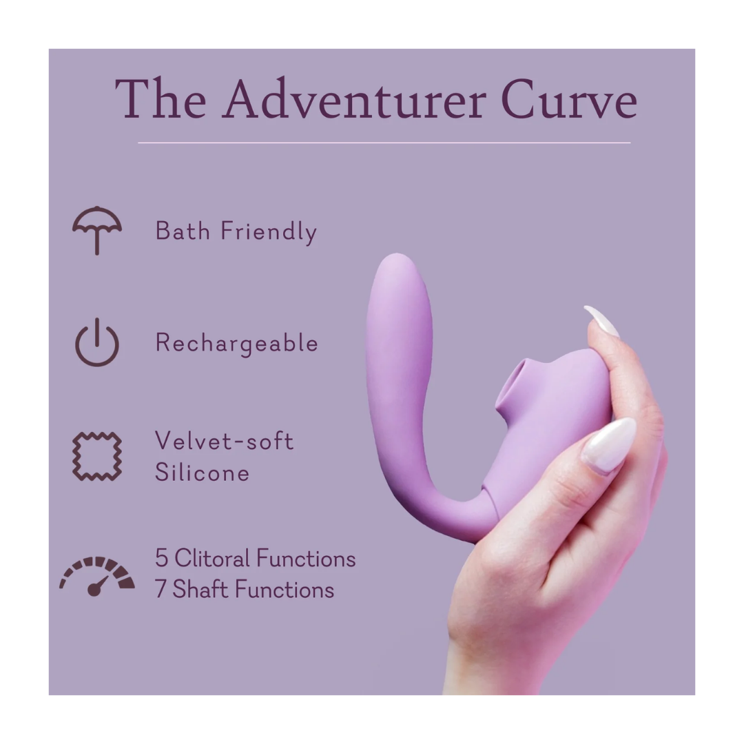 Explora el país de las maravillas eróticas que es tu cuerpo con The Adventurer Curve. Acentos de lujo, presión de aire y estimulación del punto G se unen en un festín para los sentidos. Deje que el extremo insertable lo tienda con su elección de velocidades y patrones de vibración a medida que el masajeador se curva para currucarse contra su punto de placer favorito. Déjese la funda puesta para rodear su clítoris con una presión de aire digna de jadear o quítela para una estimulación del clítoris palpitante y palpitante. ¿Cuál amarás más?
