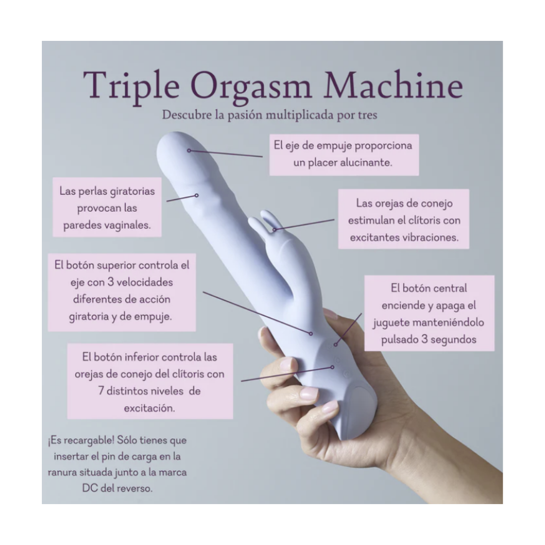 Cuando se trata de un placer poderoso y alucinante, más es siempre más. Descubra la pasión multiplicada por tres con Triple Orgasm Machine, un vibrador 3 en 1 que cuenta con 3 velocidades de empuje, acción de eje giratorio y 7 velocidades y patrones pulsantes de vibración del clítoris. A medida que el eje empuja, las perlas giratorias del interior atormentan las paredes vaginales mientras que las orejas de conejo del masajeador de clítoris provocan el clítoris con vibraciones excitantes.
