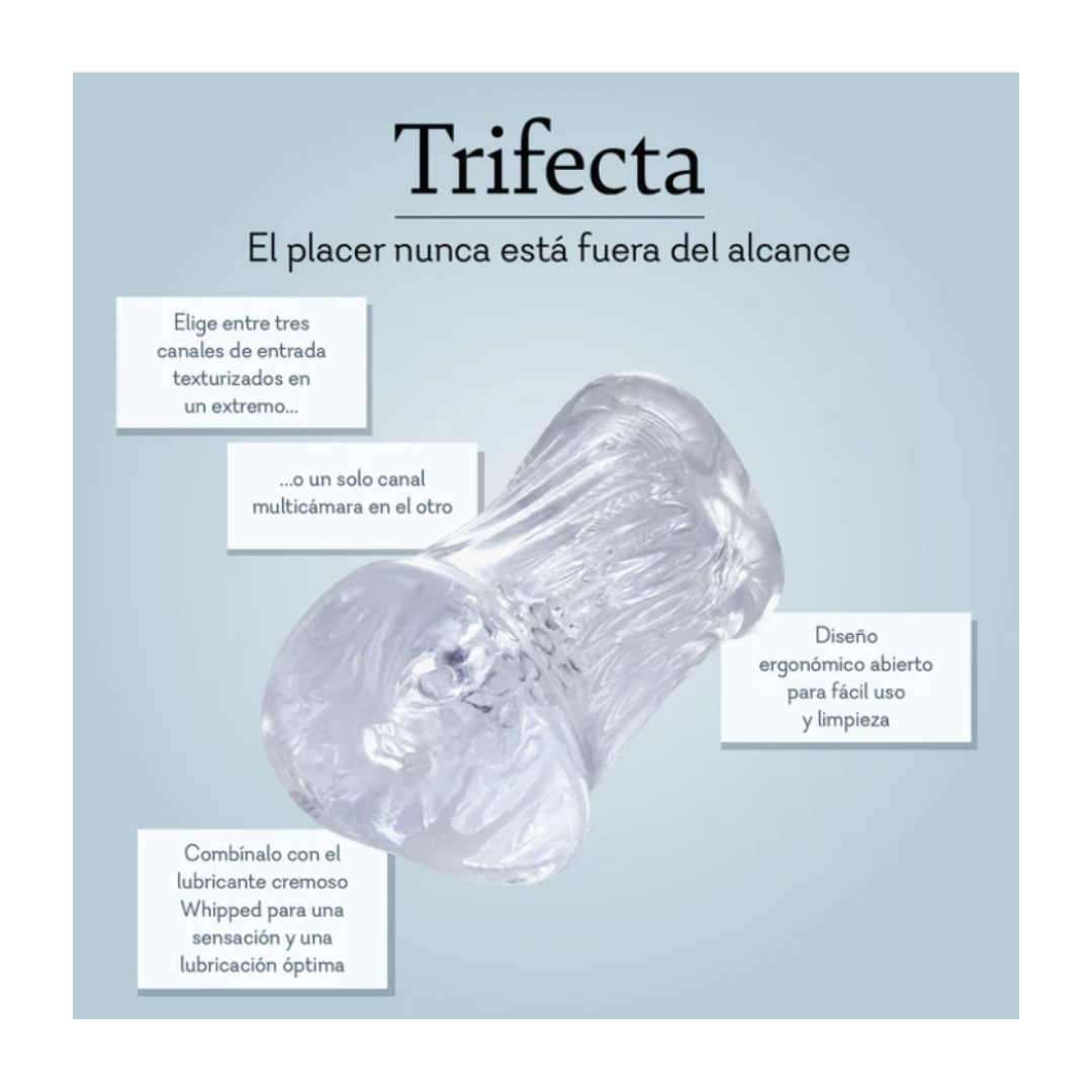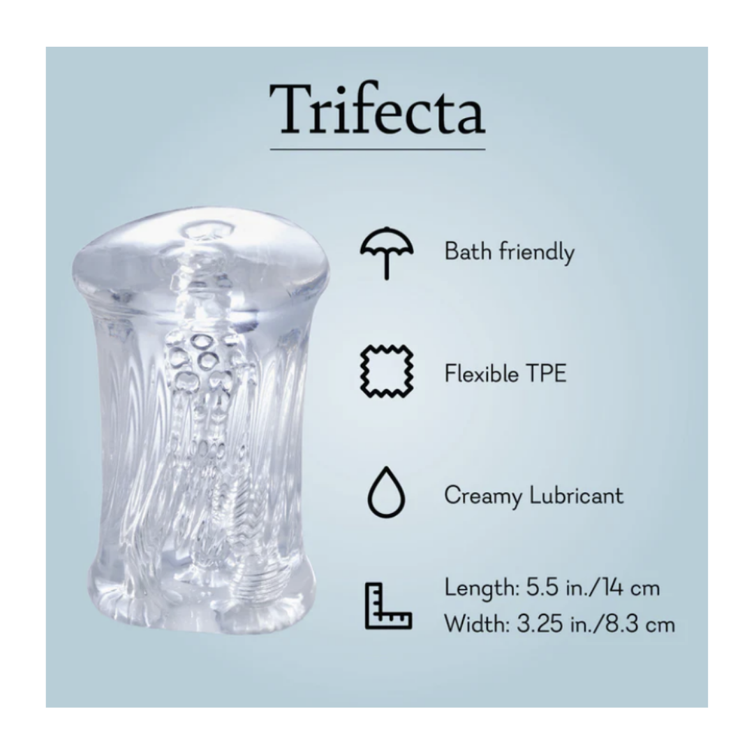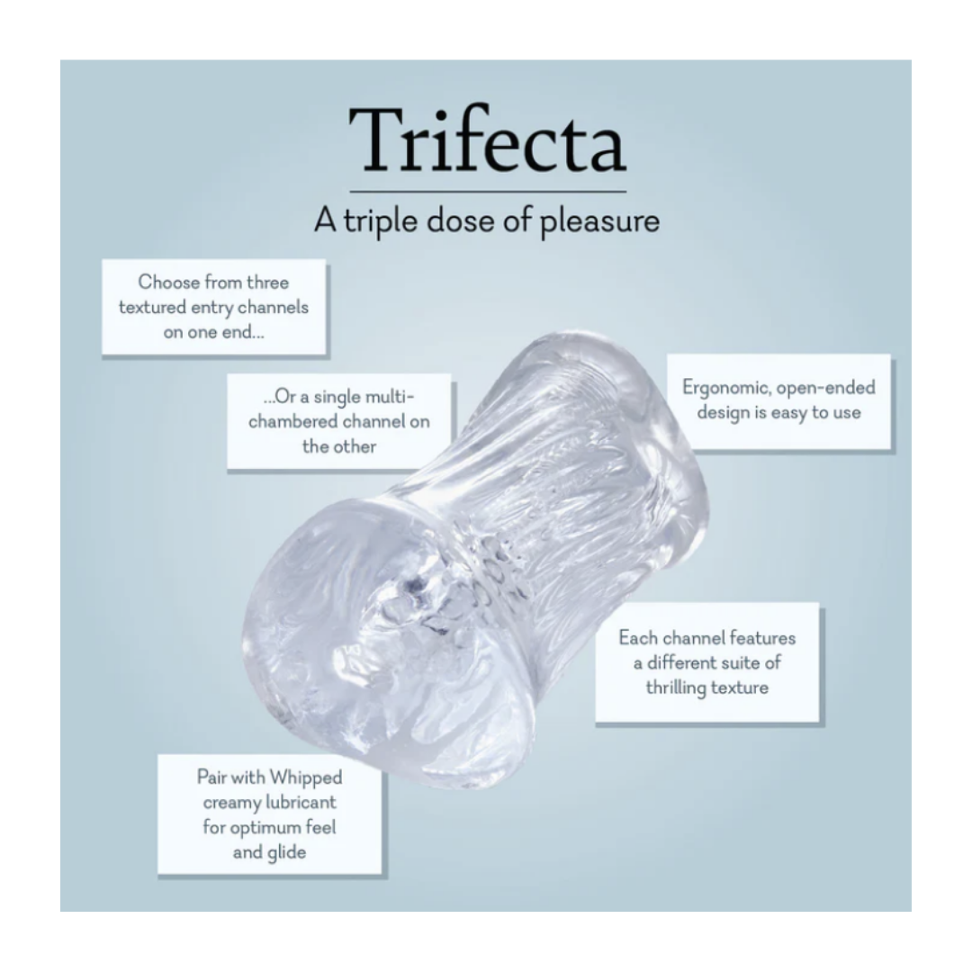 Trifecta features an open-ended design with a single opening on one side, and three choices of entry channels on the other – each with a different tantalizing texture.