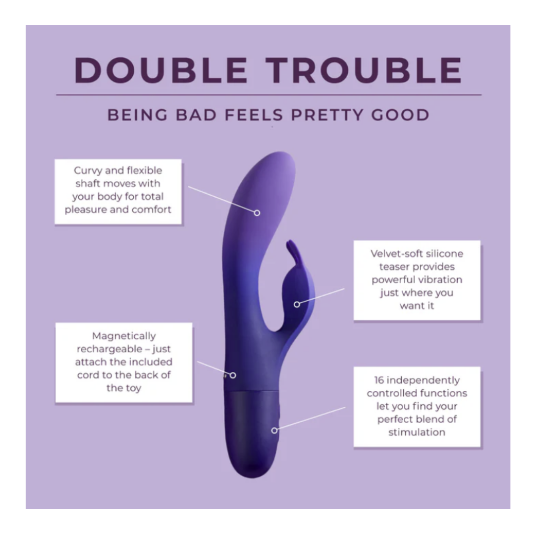 Who doesn’t love a little drama? Well, prepare for trouble…and make it double. This flexible dual-action vibe will give you a double dose of irresistible pleasure with independently controlled motors in the shaft and clitoral teaser. Each motor boasts 8 progressive speeds of vibration for a total of 16 mix-and-match ways to stir up a little bedroom drama.