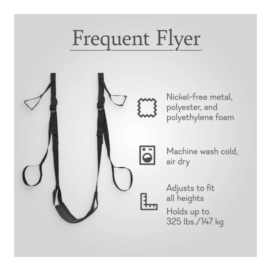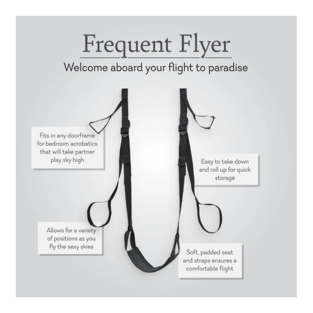 Board your non-stop flight to paradise with the Frequent Flyer Door Swing. This position aid fits in any doorframe for bedroom acrobatics that’ll take partner play to a whole new level. Once seated, position the straps and get ready to move in ways you never imagined. The swing’s design allows your partner to take hold of the seat to angle your hips. Simply set up the swing in your doorframe, adjust the straps as needed, and get ready for ultimate satisfaction.