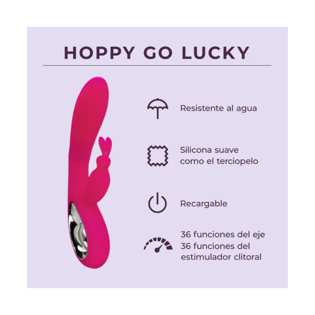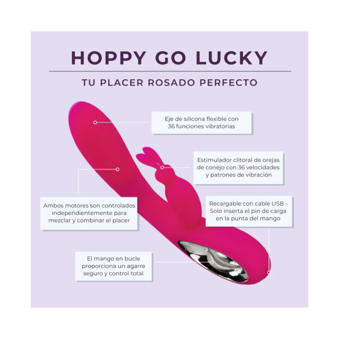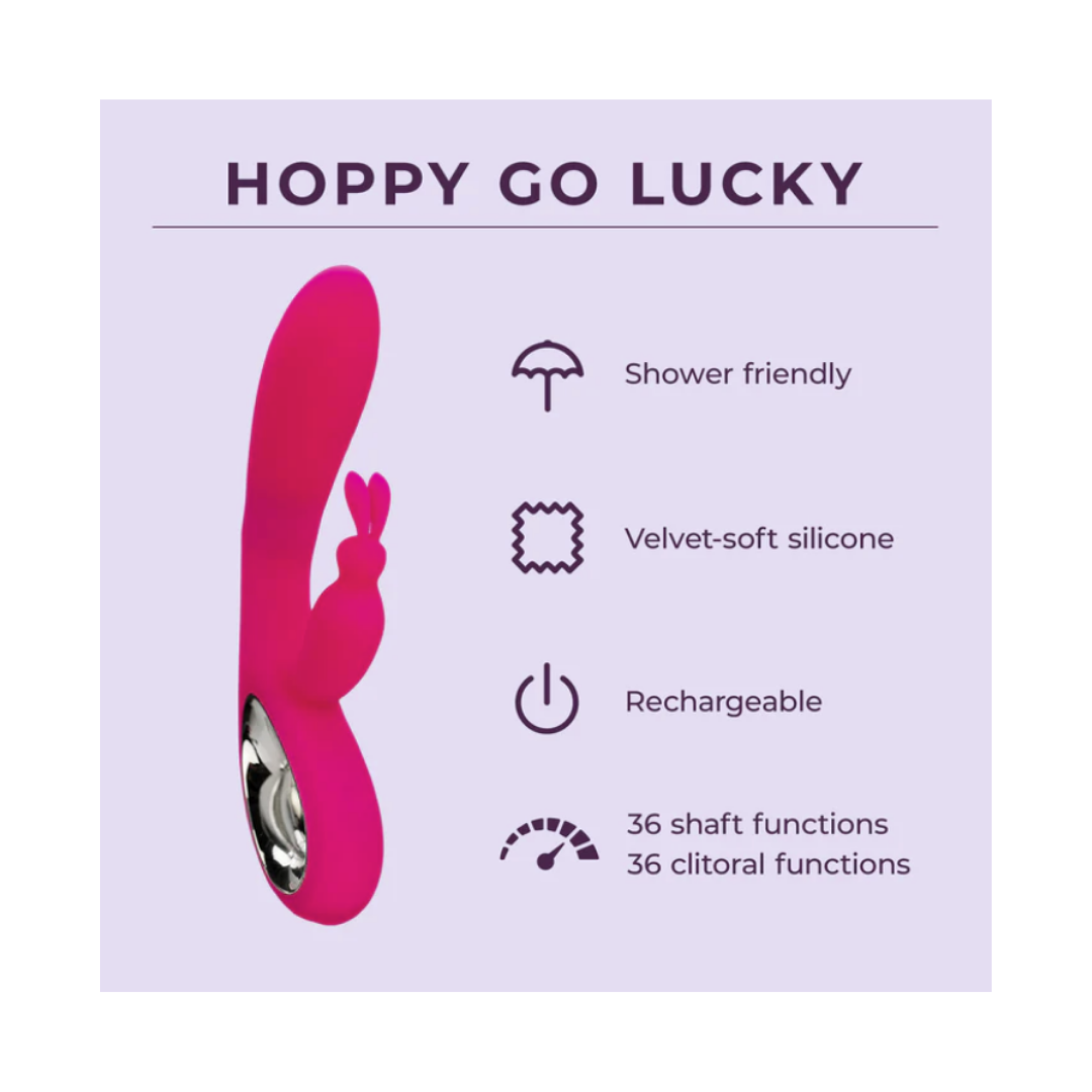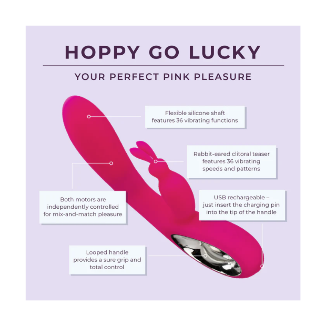 Ready to bunny-hop to bliss? Well, meet Hoppy Go Lucky. This dual-action vibrator features a looped handle, a rabbit-eared clitoral stimulator, and a flexible silicone shaft.